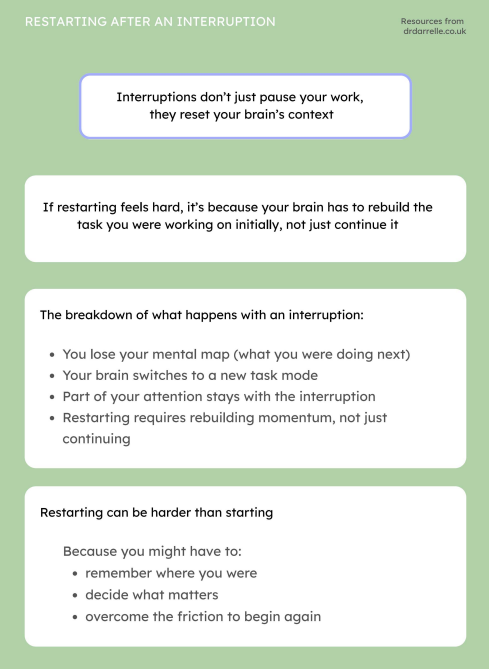 Interruptions reset your brain’s context, which is why restarting can feel harder than starting. This resource explains what’s happening and offers simple, practical strategies to make getting back on track easier.